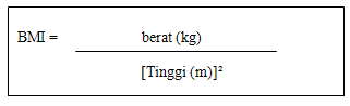 Formula BMI ialah berat dalam kilogram (kg) dibahagikan dengan kuasa dua tinggi dalam unit meter.